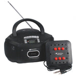 6 stereo headphone jack outputs with individual volume controls; Dual stereo input cords with both 1/4""and 3.5mm plugs. Portable Stereo MP3/ CD/Cassette Player with AM/FM Radio, USB Dock and SD Card Reader, toploading CD player that plays audio CDs and MP3 CDs. Expanded connections include a USB port for playing MP3/WMA files from USB drives and a 3.5mm jack for connecting to any device with line out audio; MP3 players or Apple devices like iPod and iPad.